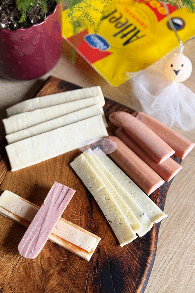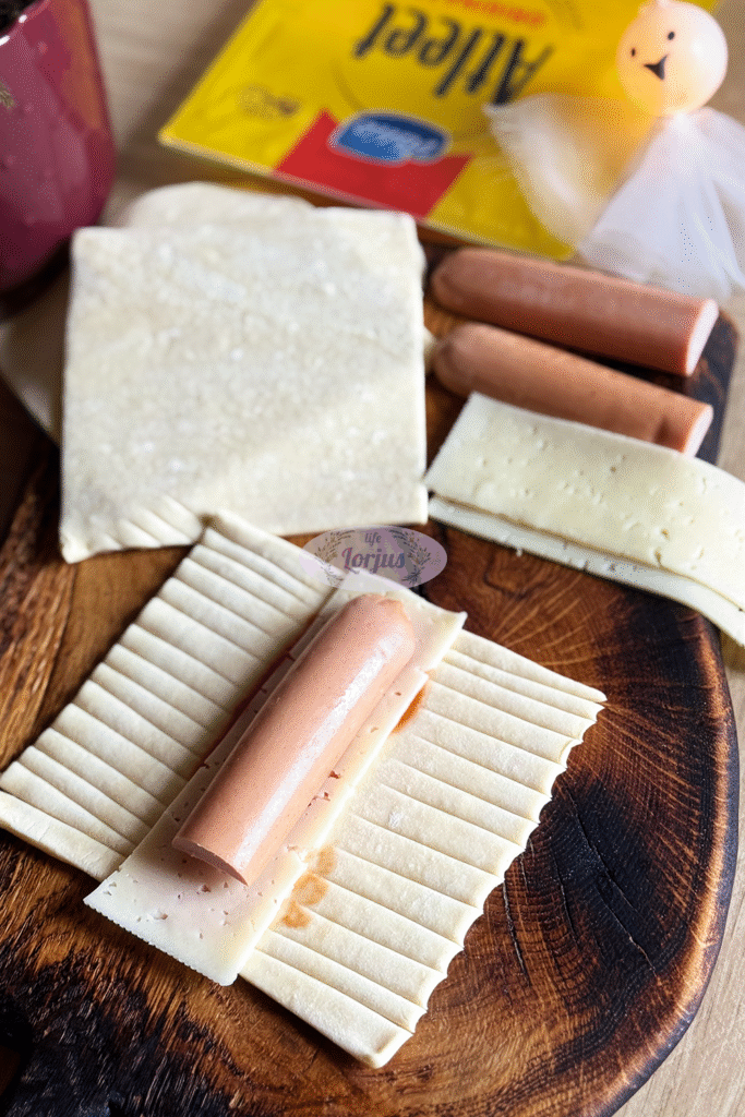 - Sluoksniuotos tešlos juosteles patepame pomidorų padažu, dedame juostelę sūrio, dešrelę (ją prieš tai galuose įpjauname – padarome kojytes) ir susukame.