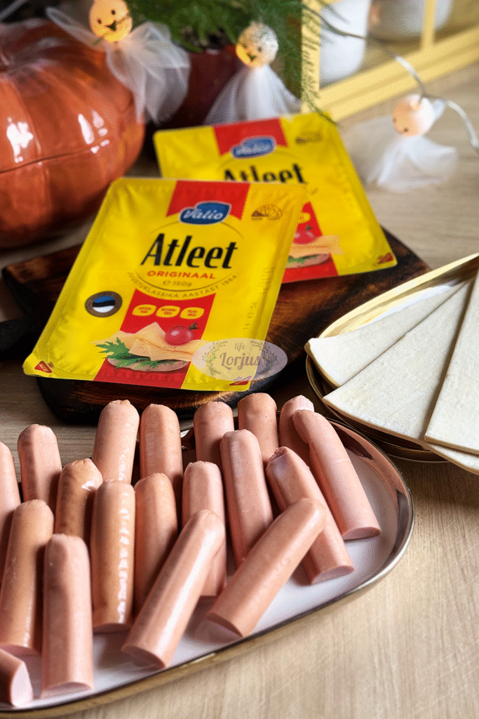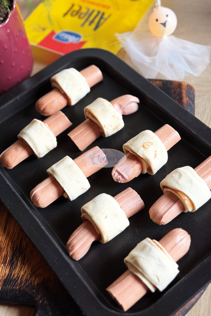 - Patepame pomidorų padažu, dedame riekelę sūrio, dešrelę ir užlenkiame tešlos kraštelius suformuodami mumijas.