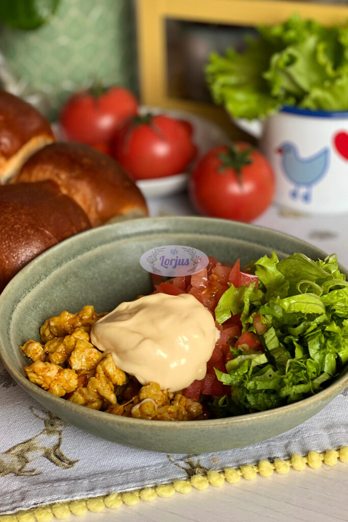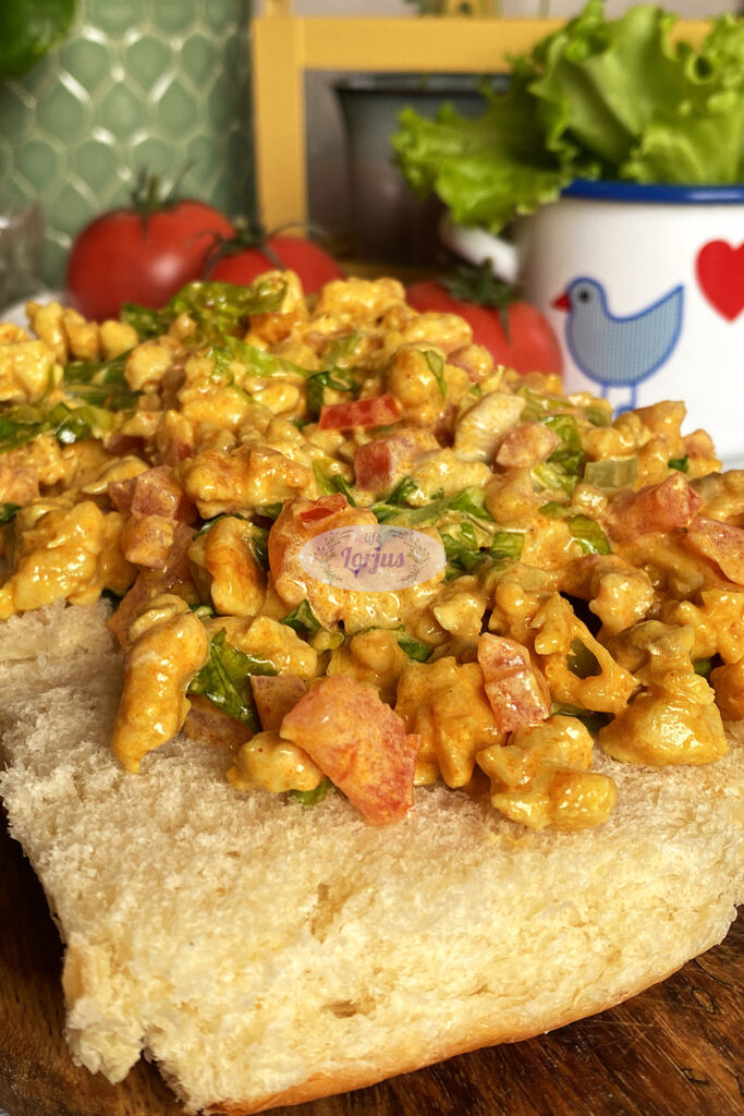 - Dedame į dubenį ir sumaišome su pjaustytu pomidoru, salotomis ir majonezu.