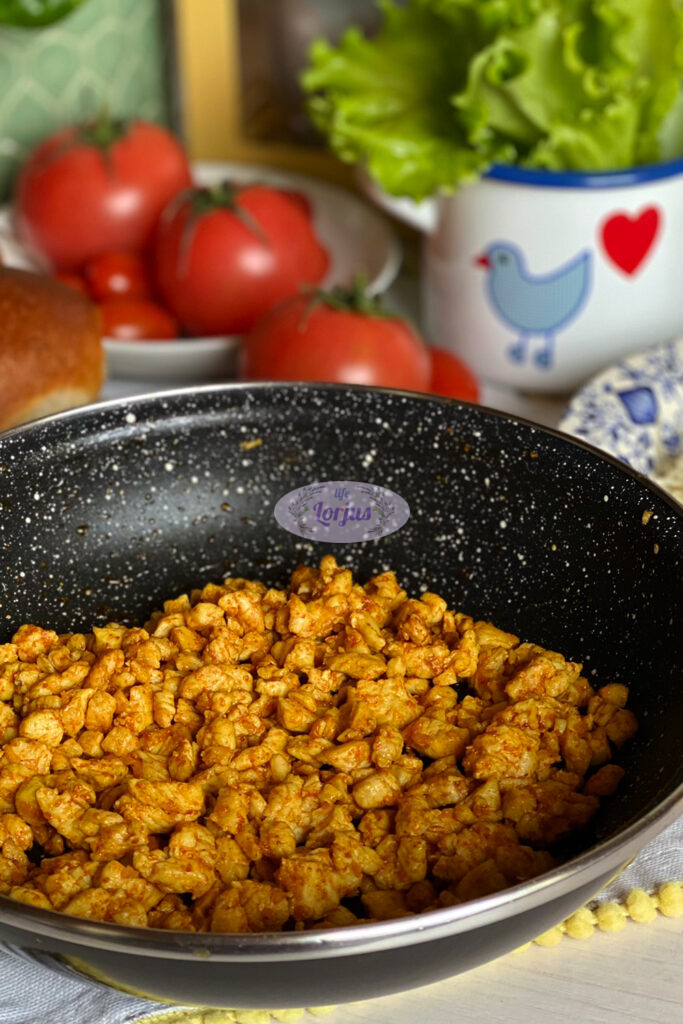 - Keptuvėje įkaitiname šiek tiek aliejaus, dedame kapotą vištos krūtinėlę, pabarstome mėgiamais prieskoniais vištienai, įspaudžiame česnako skilteles, išmaišome ir keletą minučių pakepiname.