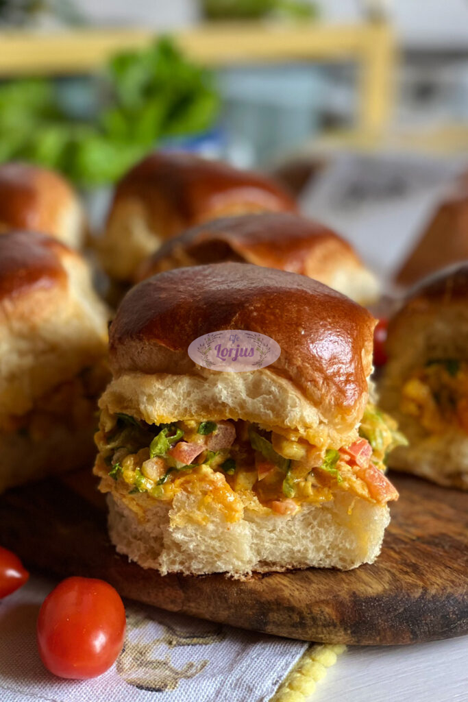 Fantastiškai skanūs brioche plėšomų bandelių sumuštiniai su pomidorais, sūriu ir vištiena.