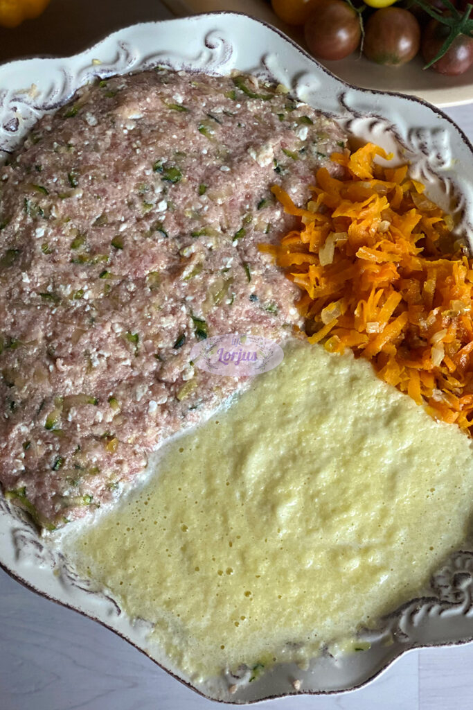 Labai gardus ir sotus, orkaitėje keptas bulvių, cukinijų ir maltos mėsos apkepas su varške.