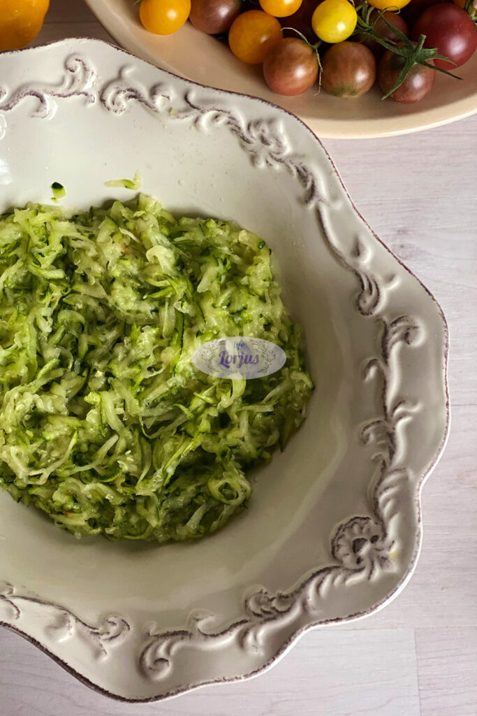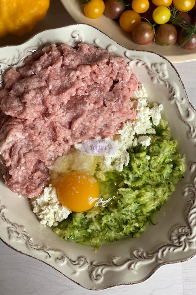 - Į dubenį dedame nuspaustas cukinijas, maltą kiaulienos kumpį, varškę, įmušame kiaušinį.
