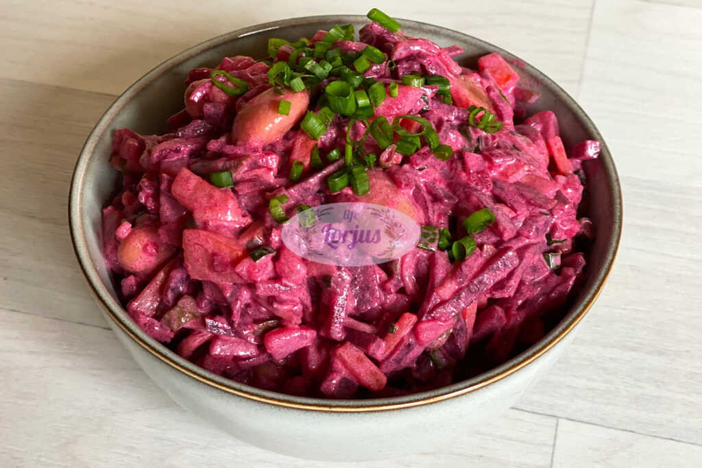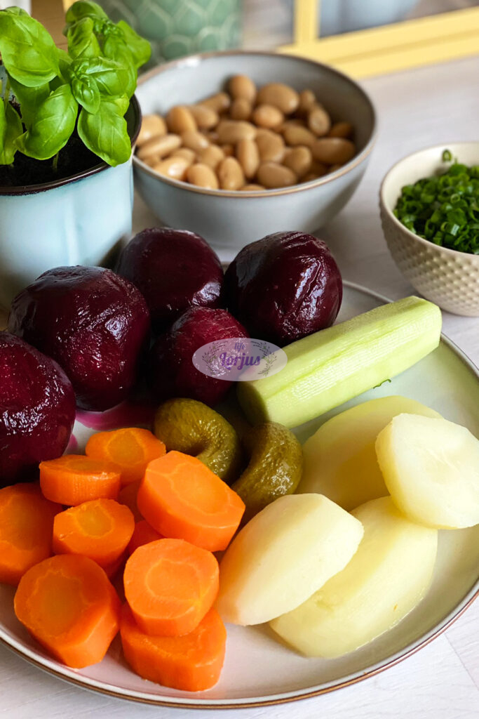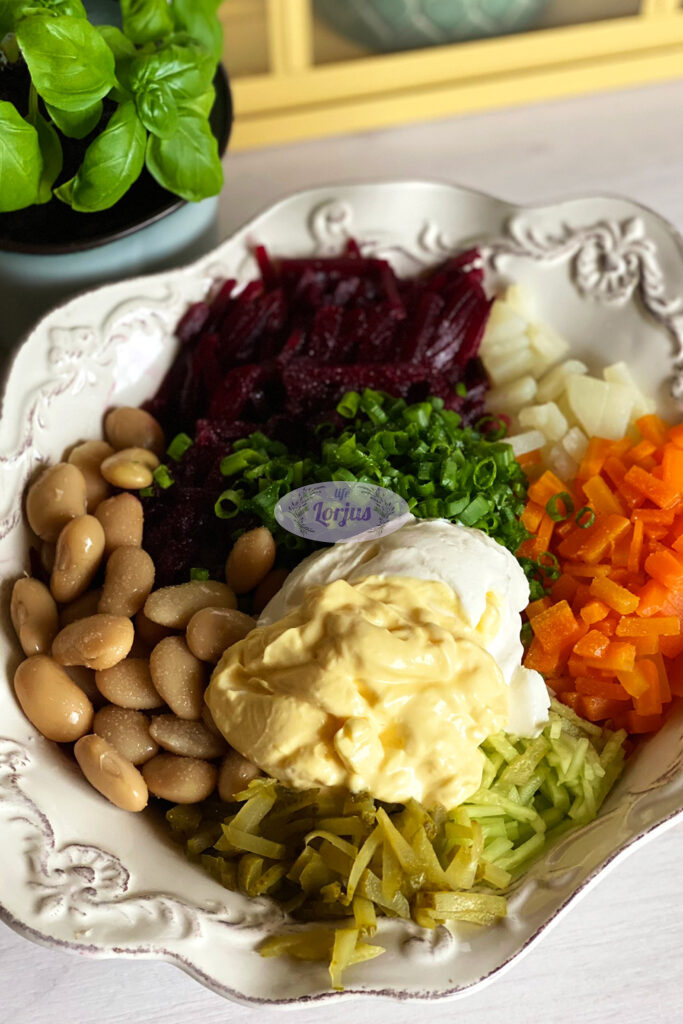 Labai gardi virtų burokėlių mišrainė su pupelėmis, šviežiu agurku ir kitomis daržovėmis.