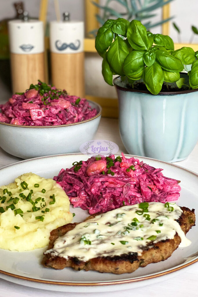 Norint, kad mišrainė būtų gražesnės ir ryškesnės spalvos, rekomenduoju dalį virtų burokėlių supjaustyti smulkiais šiaudeliais, o kitą dalį sutarkuoti burokine tarkele.