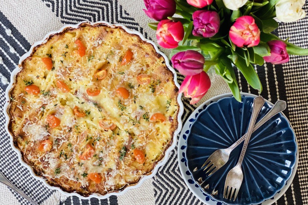 Jei mėgstate, likus maždaug 10 minučių iki kepimo pabaigos ant viršaus galima uždėti pjaustytų vyšninių pomidoriukų bei užbarstyti sūrio.
