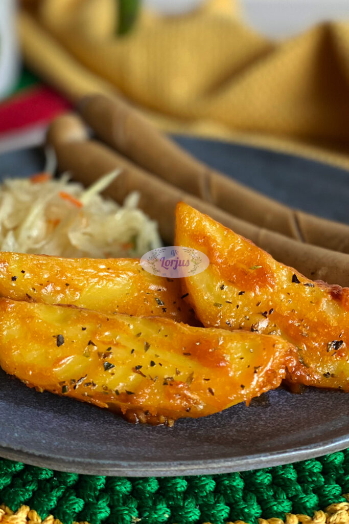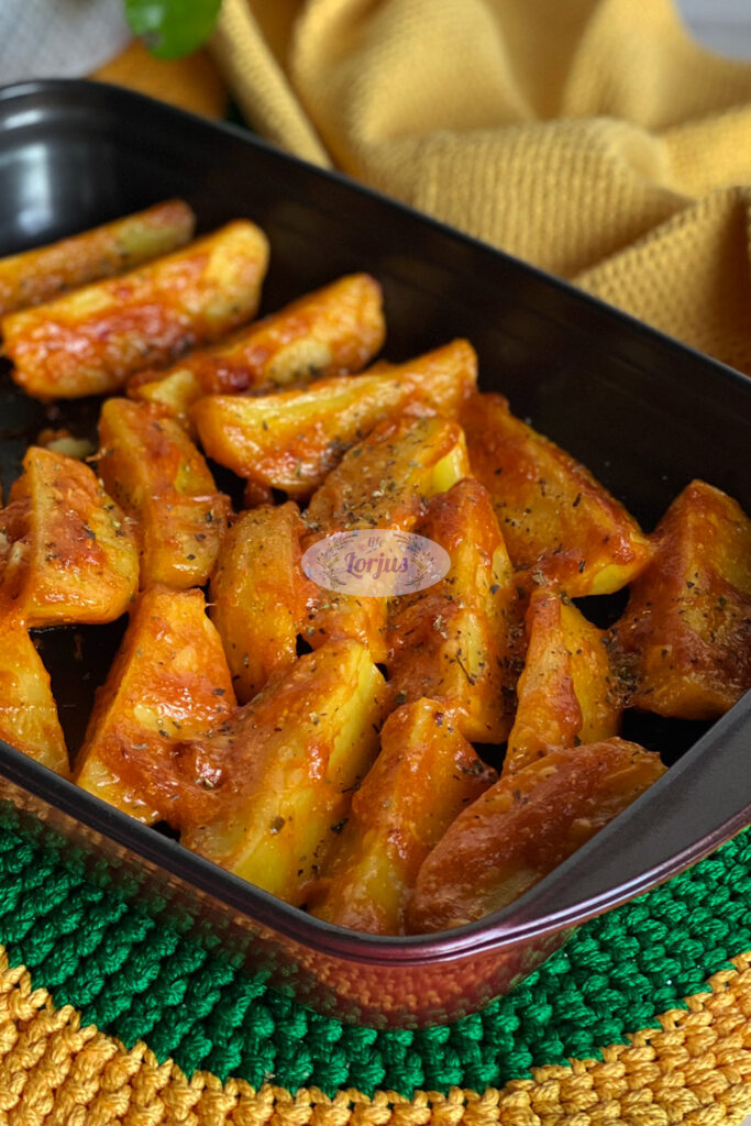 Taip pamarinuotas ir orkaitėje keptas bulves mėgstu patiekti kaip garnyrą prie įvairių keptų mėsos patiekalų, bet jas labai skanu valgyti ir vienas. Šeimynai labai patinka.