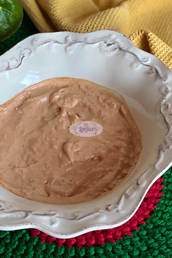 - Dubenėlyje sumaišome šaukštą miltų su pomidorų padažu ir majonezu, įspaudžiame česnako skilteles, beriame universalaus prieskonių mišinio.