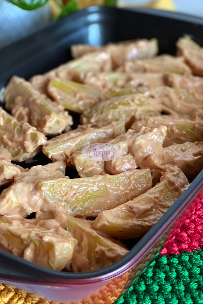 - Pasiruoštu marinatu aptepame virtas bulves ir dedame į aliejumi pateptą kepimo indą.