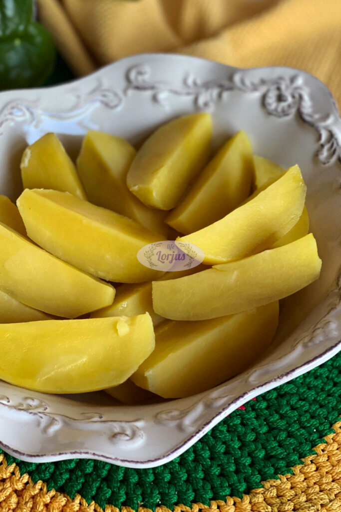 - Bulves nuskutame, perpjauname į keturias dalis, beriame į puodą, pabarstome druska, užpilame vandeniu ir verdame kol bulvės kiek suminkštės tačiau pilnai neišvirs.