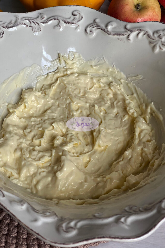 - Į dubenį dedame tris-keturis valgomuosius šaukštus majonezo, smulkia tarkele įtarkuojame maždaug 40-50g. “Gouda” sūrio, įspaudžiame česnako skilteles ir išmaišome.
