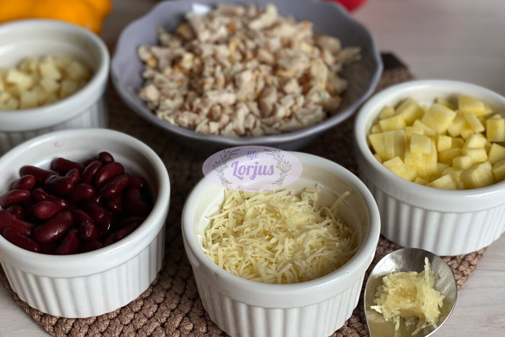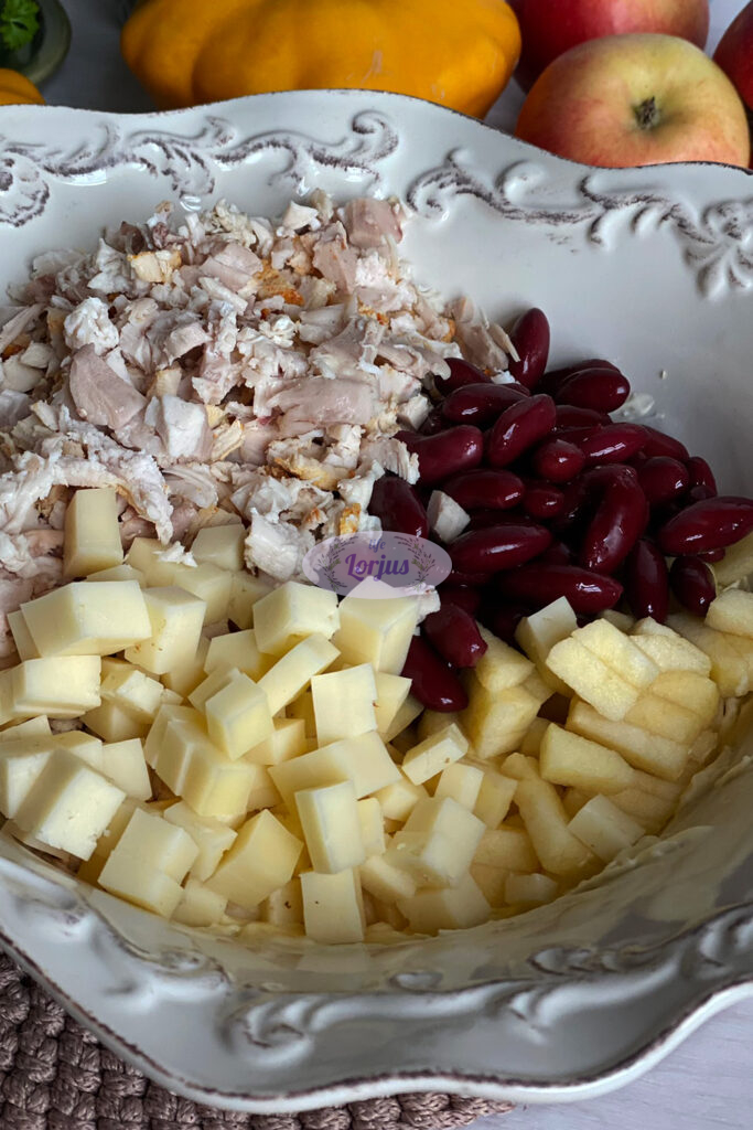 - Beriame pjaustytus obuolius, konservuotas raudonąsias pupeles, keptą vištieną, sūrį ir išmaišome.