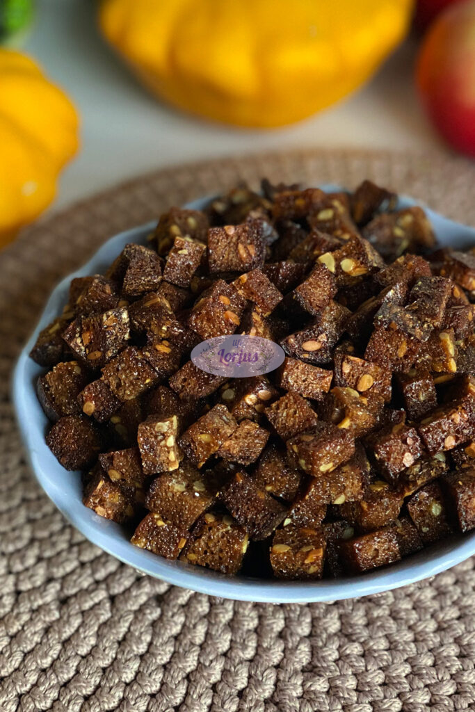 - Beriame keptos duonos kubelius ir dar kartą gerai išmaišome.