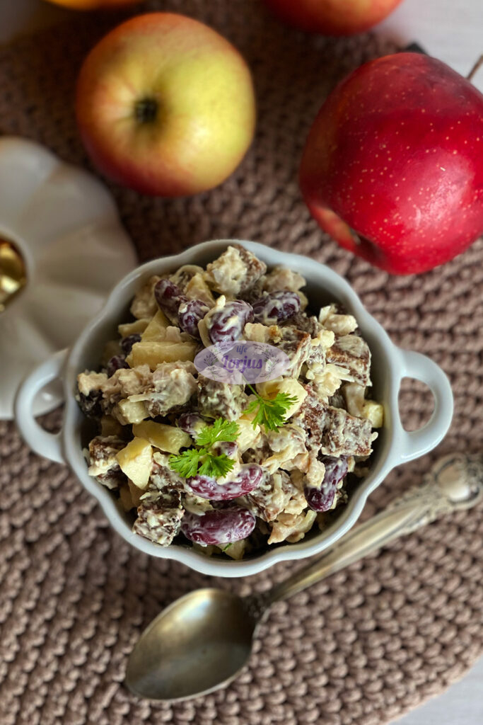 Labai gardi ir soti, keptos duonos ir pupelių mišrainė su kepta vištiena, sūriu ir obuoliais.