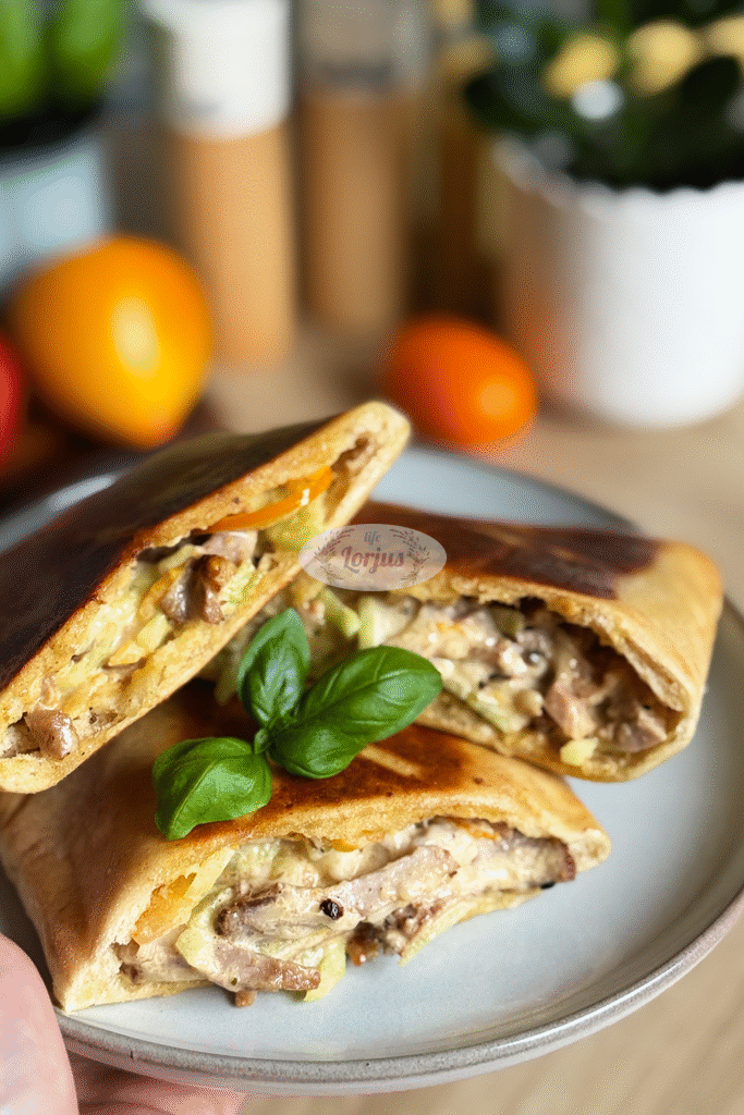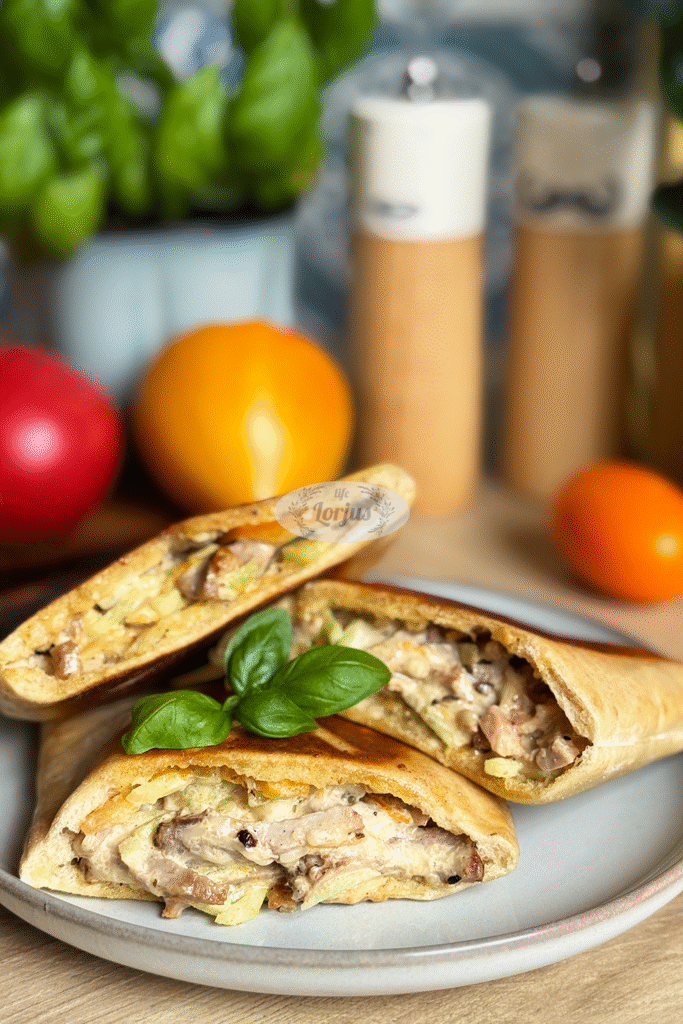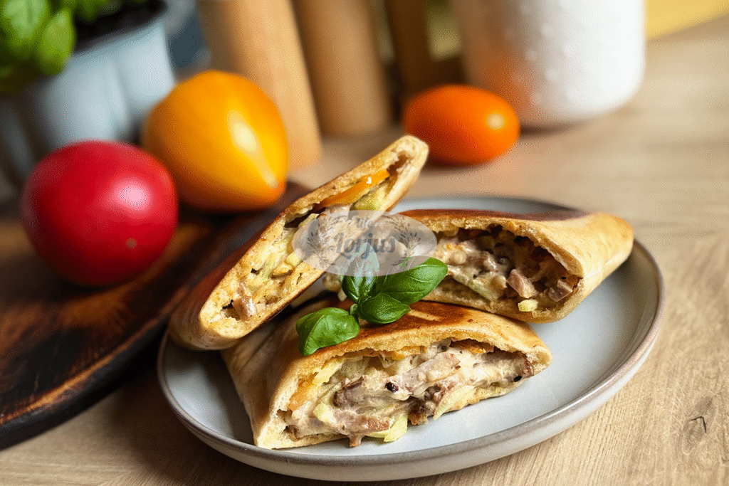- Pasiruoštu įdaru įdarome “kišenėles”, kurias dedame į įkaitintą keptuvę su trupučiu sviesto ir kelias minutes pakepame iš abiejų pusių.