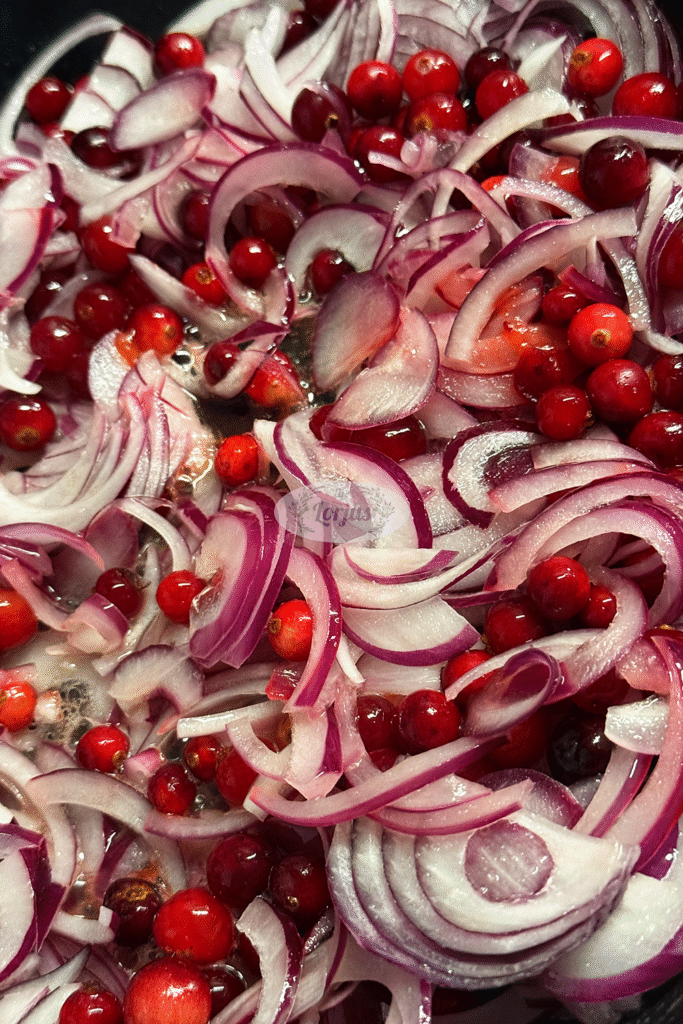 - Į gerai įkaitintą keptuvę įpilame truputį ypač tyro alyvuogių aliejaus, dedame pjaustytus svogūnus, beriame spanguoles, pabarstome druska, išmaišome ir keptuvę uždengę dangčiu troškiname ant kiek silpnesnės nei vidutinio kaitrumo ugnies apie 12-15 minučių.