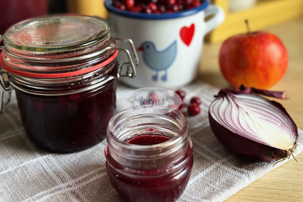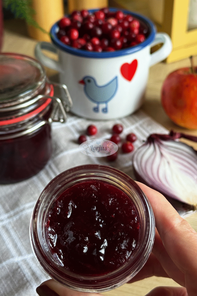 - Gardusis svogūnų ir spanguolių padažas paruoštas, supilsome į iškaitintus, švarius, sausus stiklainius, užsukame dangteliais ir paliekame laukti skanios progos.