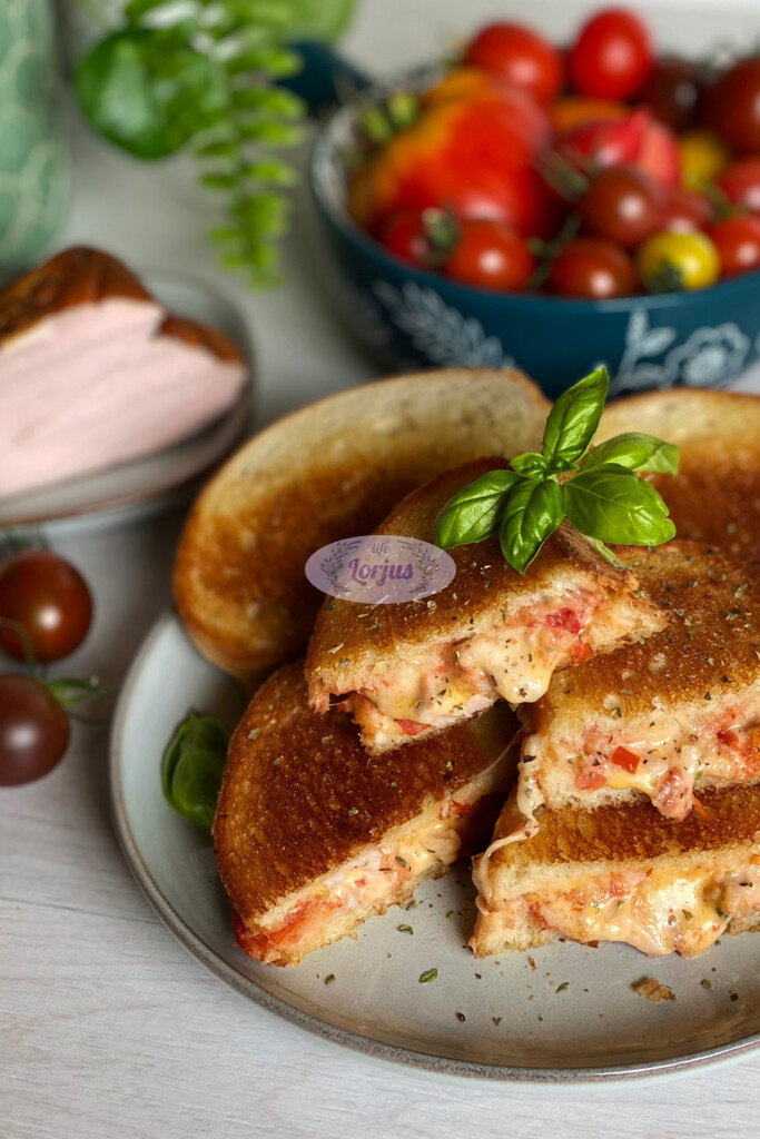 Greitai ir lengvai karšti sumuštiniai keptuvėje su kumpiu, sūriu ir pomidorais.