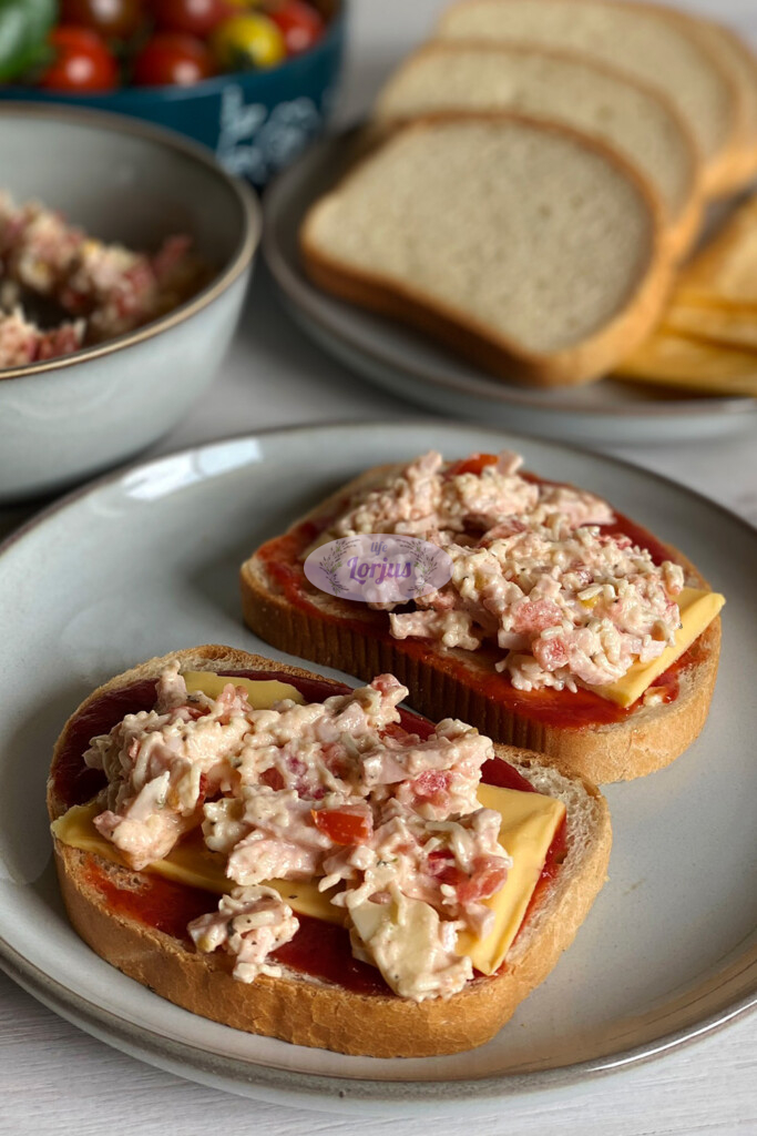 - Keturias batono riekeles patepame sviestu, pomidorų padažu, ant viršaus dedame po lydyto “Čederio” sūrio riekelės puselę, užtepame pasiruoštos masės.