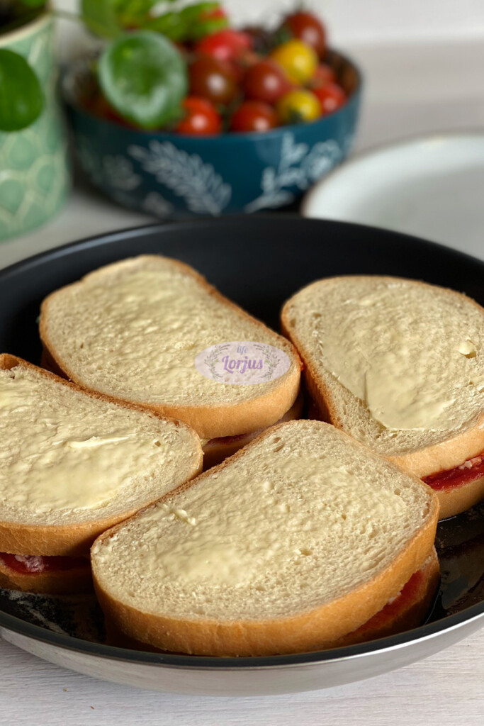 - Kepame įkaitintoje keptuvėje su trupučiu sviesto ant nelabai stiprios ugnies po kelias minutes iš abiejų pusių – kol duonos riekelės švelniai paruduos, o sūris išsilydys.