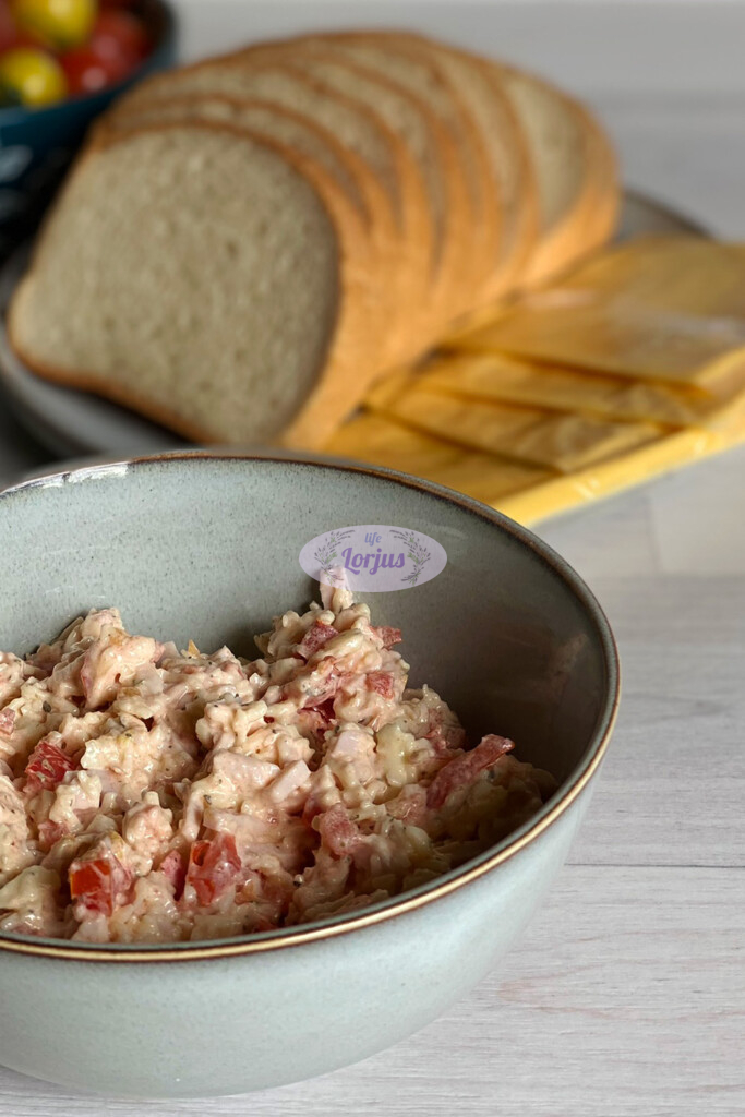 - Dubenelyje sumaišome tarkuotą sūrį, pjaustytus pomidorus ir kumpį su majonezu, prieskoninių žolelių mišiniu.