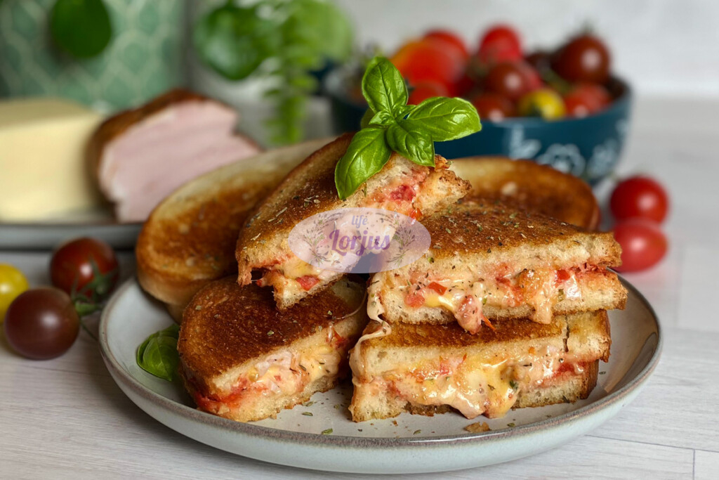 Greitai ir lengvai karšti sumuštiniai keptuvėje su kumpiu, sūriu ir pomidorais.
