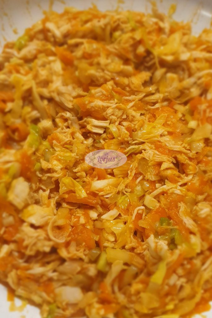 Keptuvėje įkaitiname aliejų. Dedame kapotą svogūną, česnako skilteles, pabarstome druska ir kepiname apie 5 minutes. Sudedame burokine tarkele tarkuotas morkas ir dar kepiname apie 5-8 minutes. Šakutės pagalba suplėšome virtą vištienos filė. Dedame į keptuvę ir kepiname apie 5 minutes. Sudedame pjaustytą baltagūžį kopūstą, pomidorų padažą ir keptuvę uždengę dangčiu troškiname apie 8 minutes.