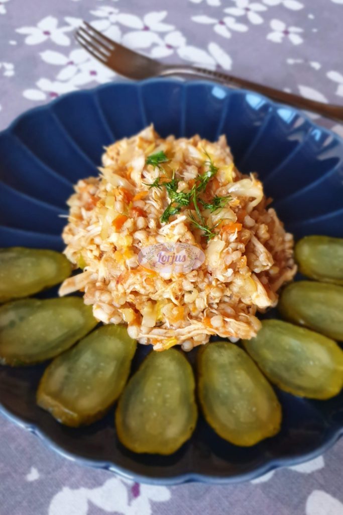 Į keptuvę su daržovėmis ir vištiena sudedame išvirusius grikius. Išmaišome, pakepiname keletą minučių ir patiekiame.