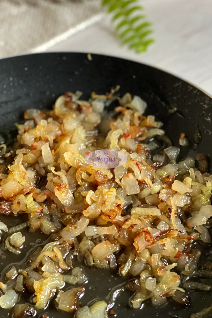 - Pirmiausia keptuvėje su trupučiu aliejaus pasikepiname smulkiai pjaustytus rūkytus lašinukus su 3 galvutėmis svogūno.