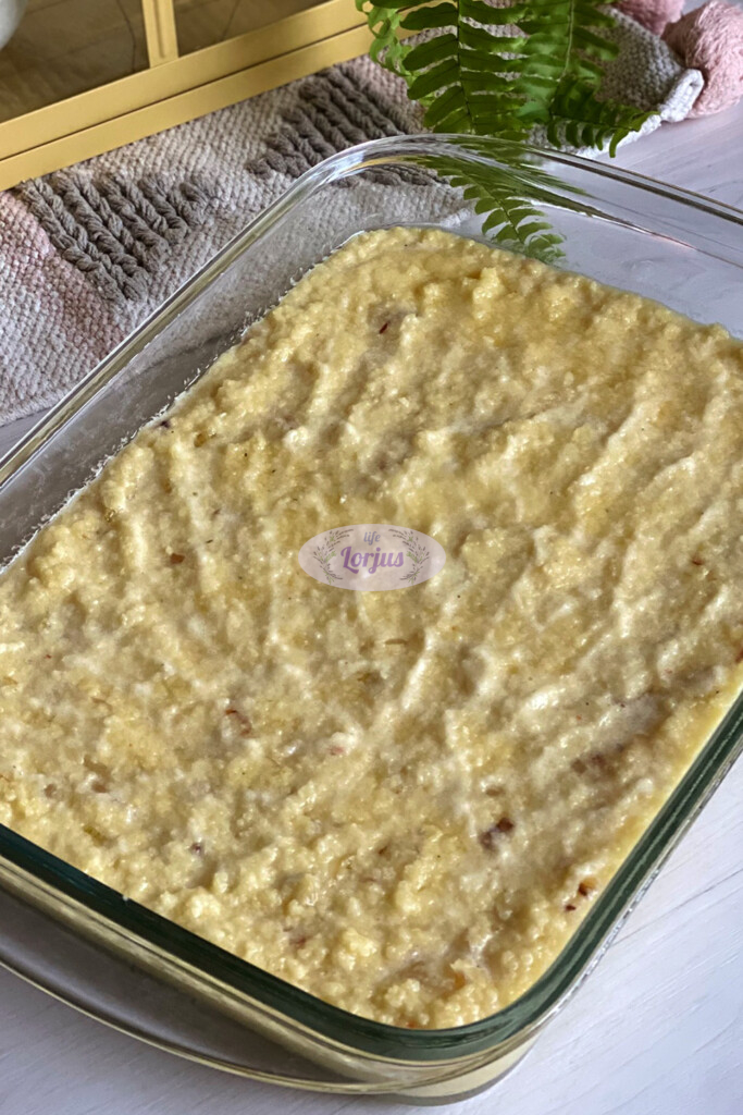- Į aliejumi pateptą kepimo formą tolygiai paskirstydami supilame pasiruoštą masę.