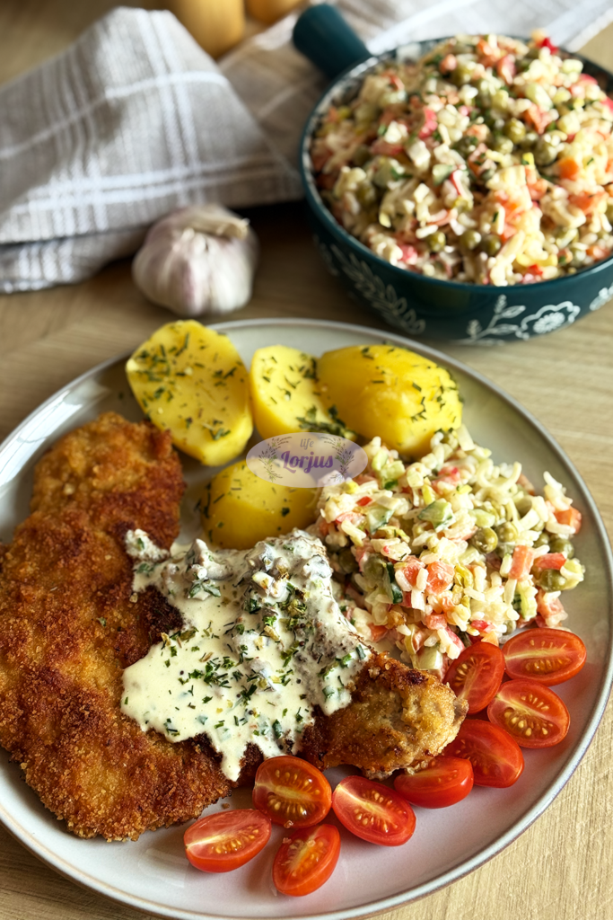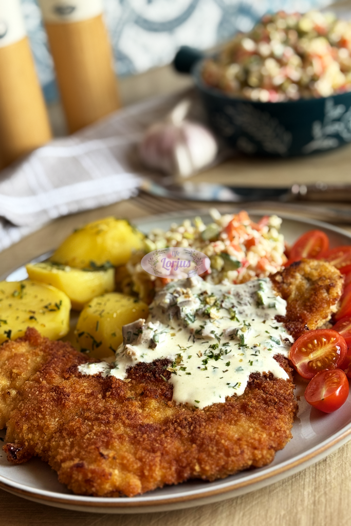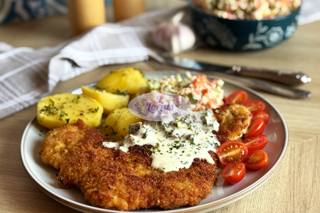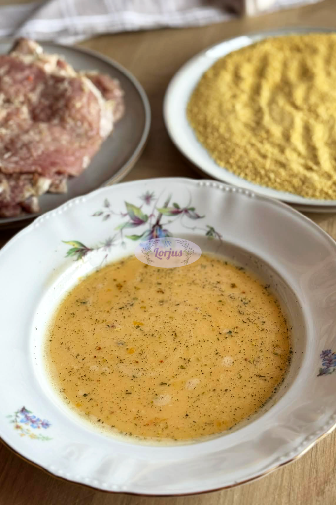 - Imame išmarinuotą išmuštą kiaulienos pjausnį, pamirkome kiaušinių plakinyje ir apvoliojame maltuose džiūvesėliuose.