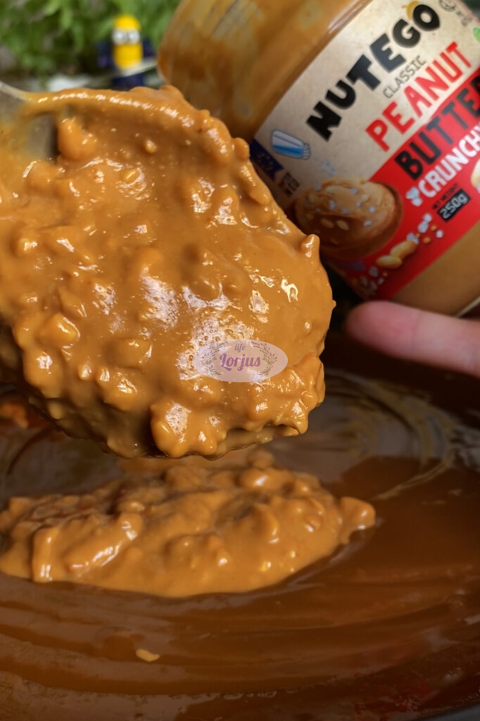 - Įdedame du kupinus šaukštus žemės riešutų sviesto ir išmaišome.