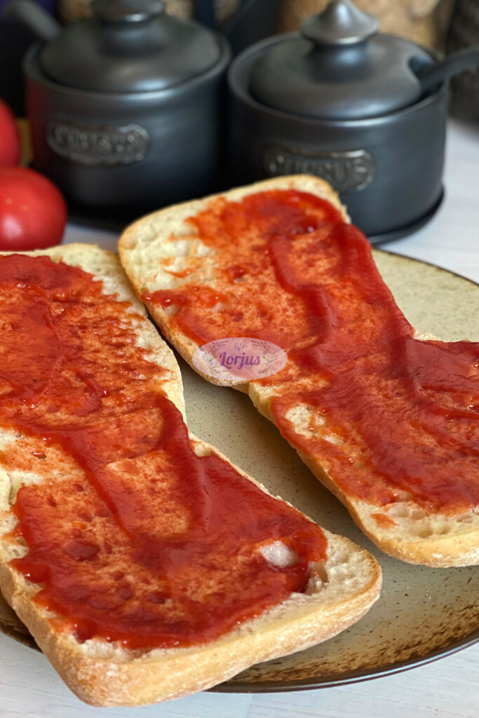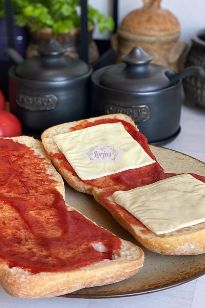 - Čiabatos kepalėlį perpjauname pusiau, aptepame pomidorų padažu arba kečiupu.