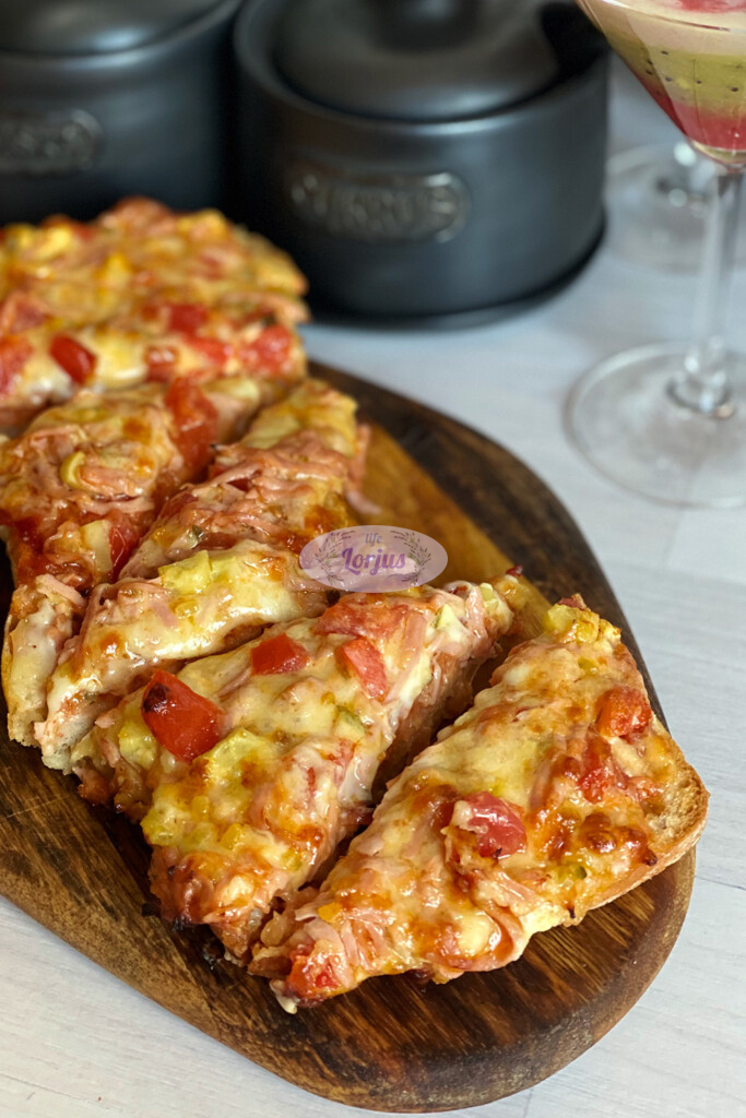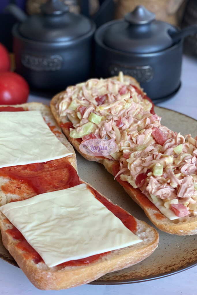 Šį kartą karštus sumuštinius kepiau ant pusiau perpjauto čiabatos kepalėlio, jei neturite ar nemėgstate čiabatos, galite pasiruoštą dešros ir sūrio masę dėti ant paprasto batono ar forminės duonos riekelių. Bus nemažiau skanu!