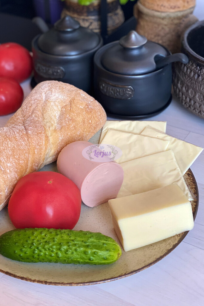 Labai gardūs, orkaitėje kepti karšti sumuštiniai su dešra, sūriu, šviežiais agurkėliais ir pomidorais.