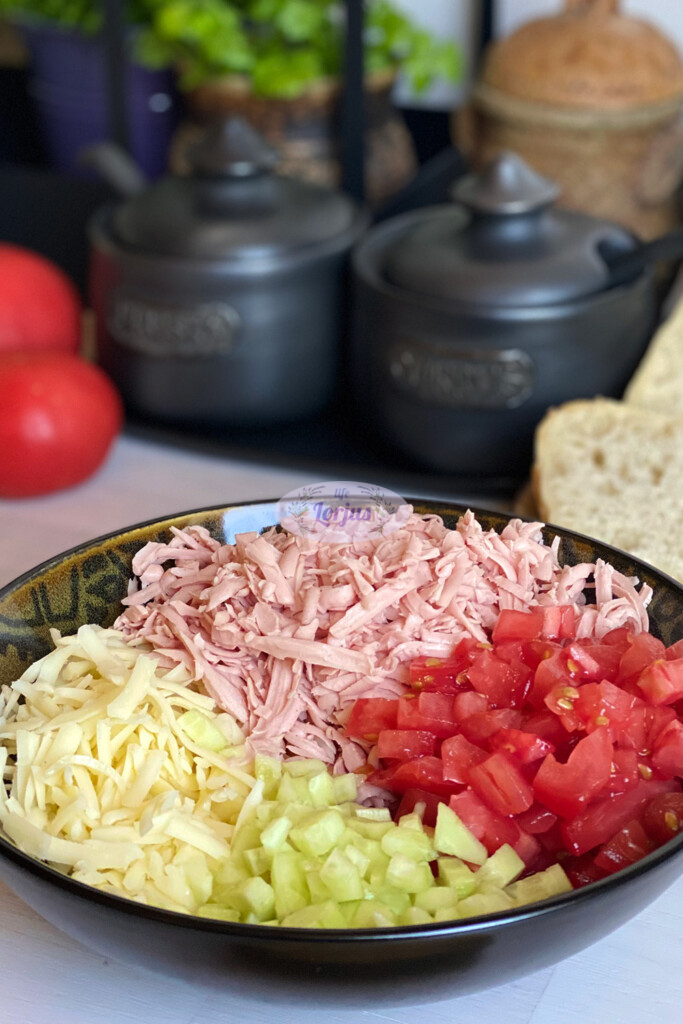 - Į dubenį beriame tarkuotą virtą “Daktarišką” dešrą, mocarelos sūrį, pjaustytus agurkus ir pomidorus.