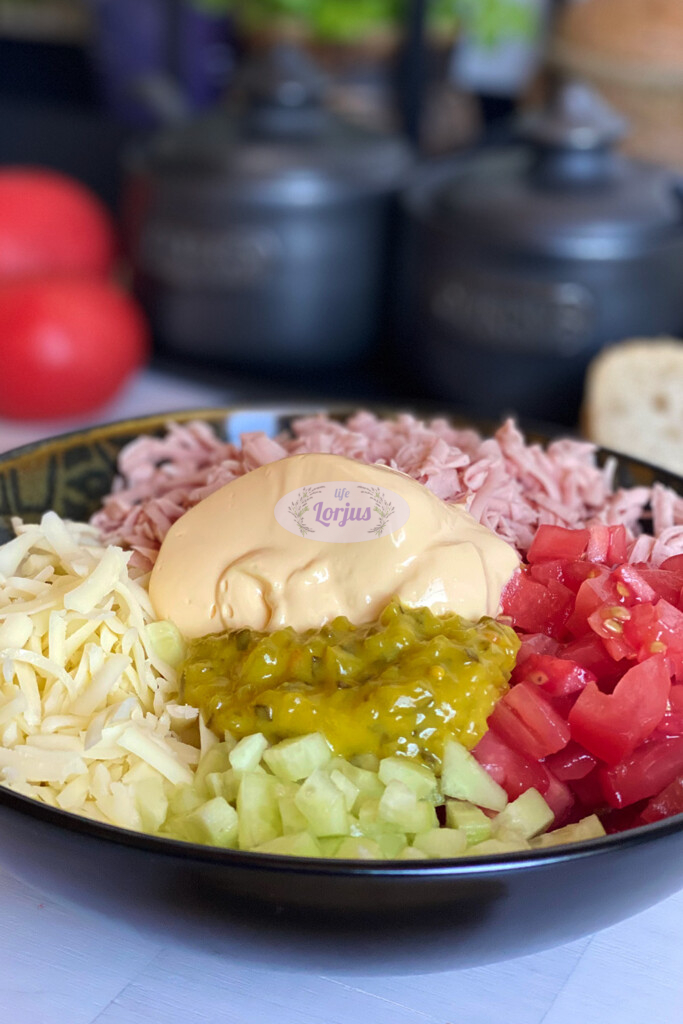 - Įdedame po valgomąjį šaukštą agurkų ir garstyčių salotų, majonezo.