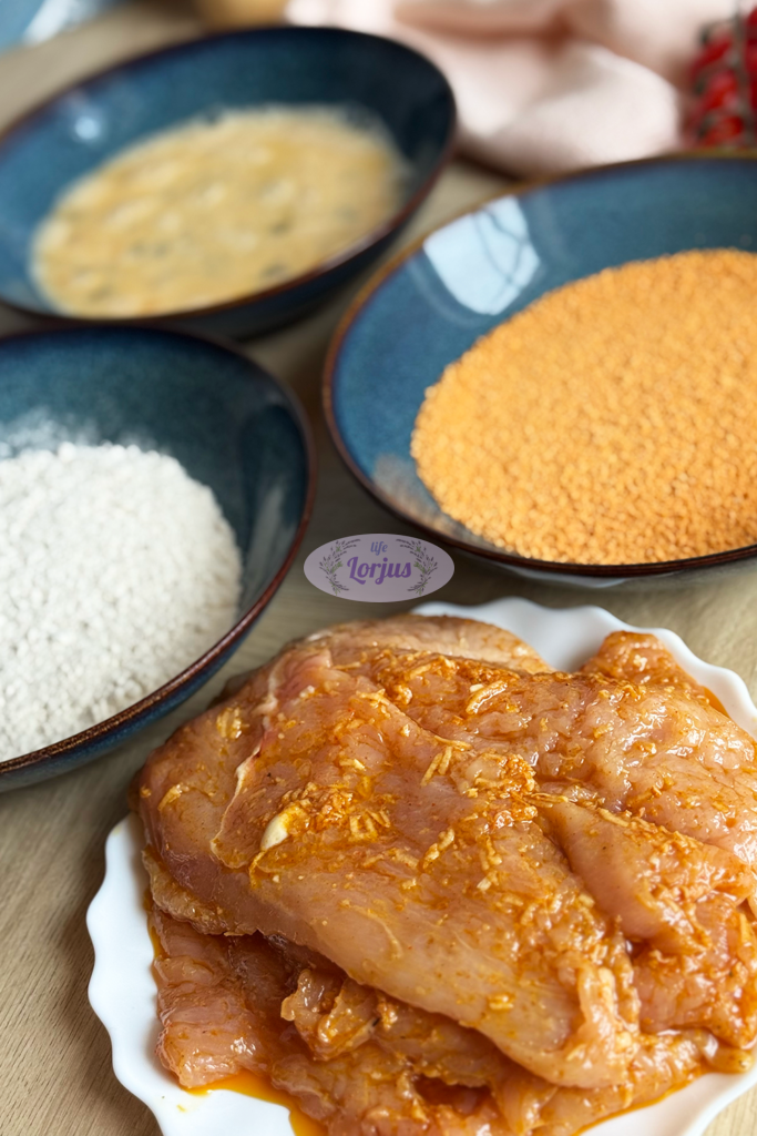- Apvoliojame miltuose, merkiame į kiaušinių plakinį, apvoliojame maltuose džiūvesėliuose.