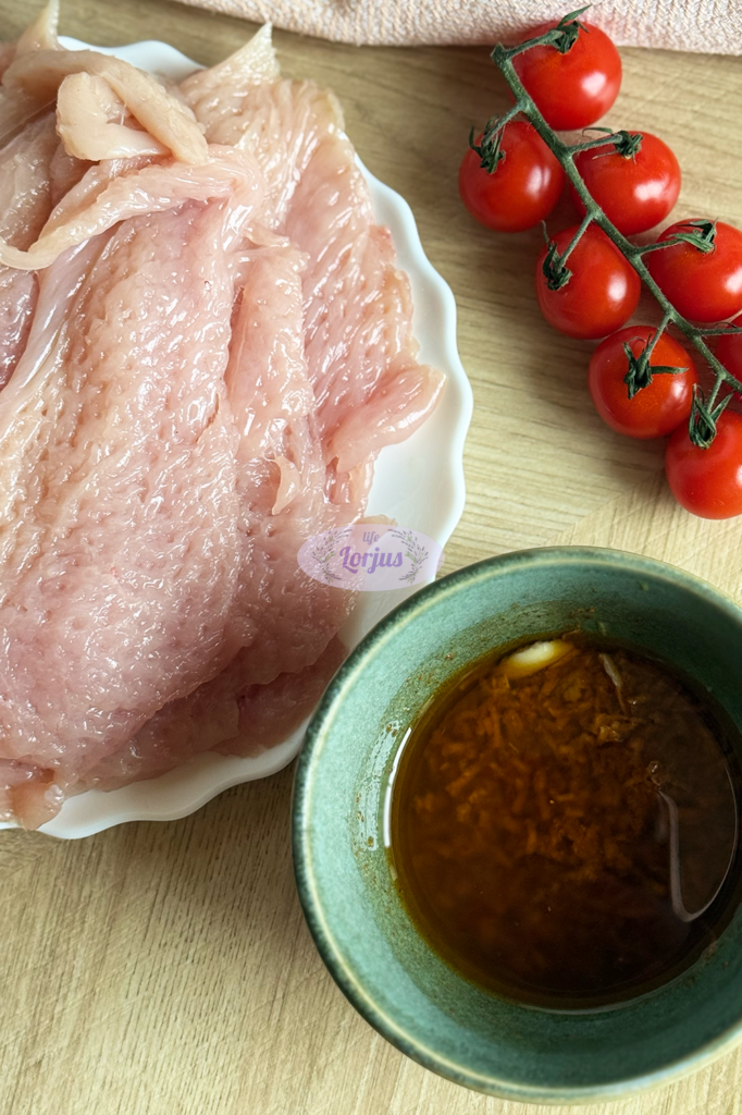 - Pasiruoštu marinatu ištepame išmuštus vištienos krūtinėlės pjausnius.