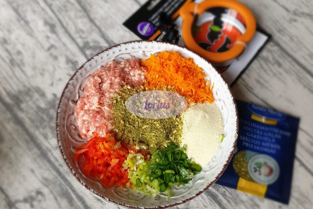 Maltą mėsą dedame į dubenį. Smulkia tarkele įtarkuojame morką, imušame kiaušinį, beriame manų kruopas, prieskonius, smulkiai pjaustytą papriką, svogūnų laiškus ir išmaišome.