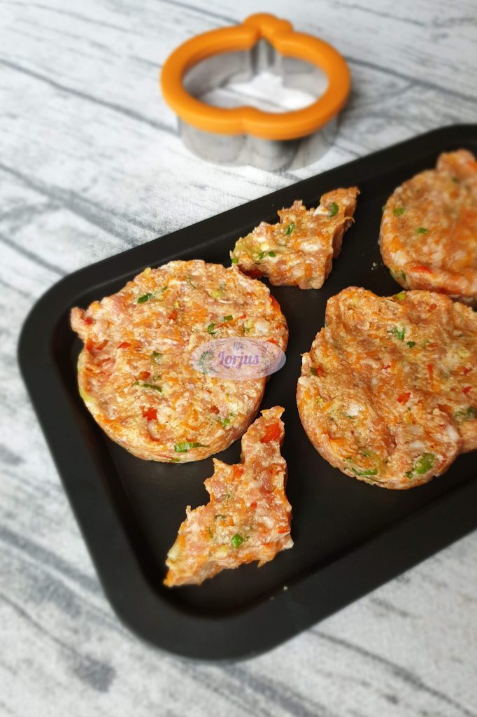 Imame formelę, ją dedame ant kepimo skardos (Jei skardelė linkusi pritraukti kepinius, naudokite kepimo popierių) ir į vidų pridedame pasiruoštos maltos mėsos, formelę atsargiai nuimame.