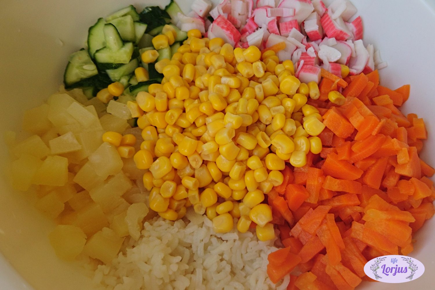 Į dubenį beriame konservuotus kukurūzus, virtus ryžius, kubeliais pjaustytas virtas morkas, trumpavaisius agurkėlius, smulkintas krabų lazdeles ir ananasus.