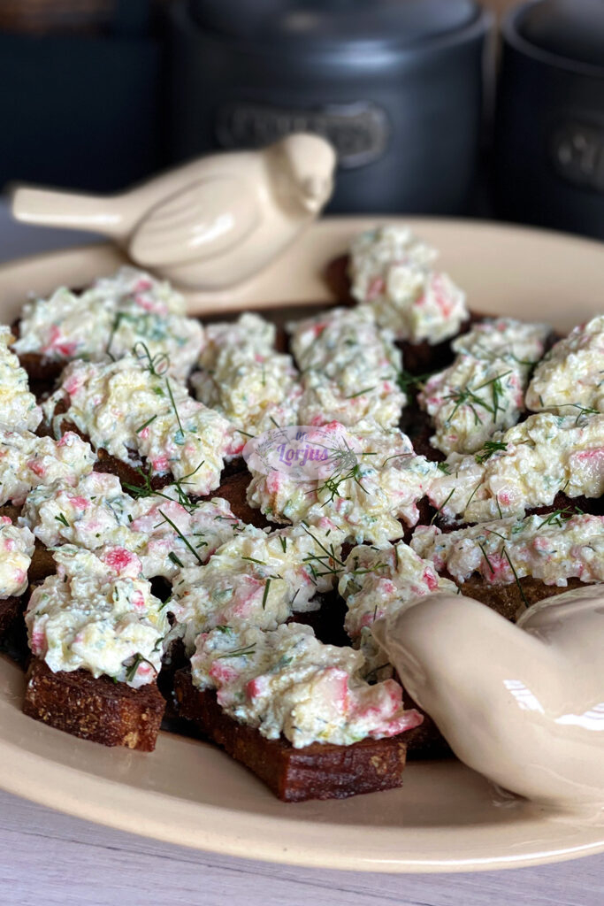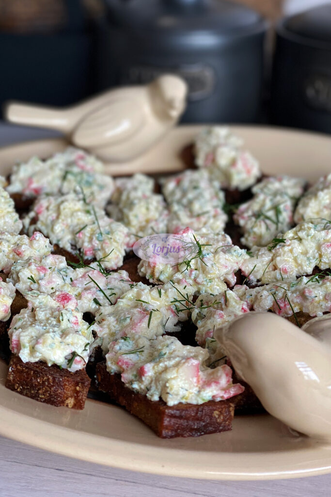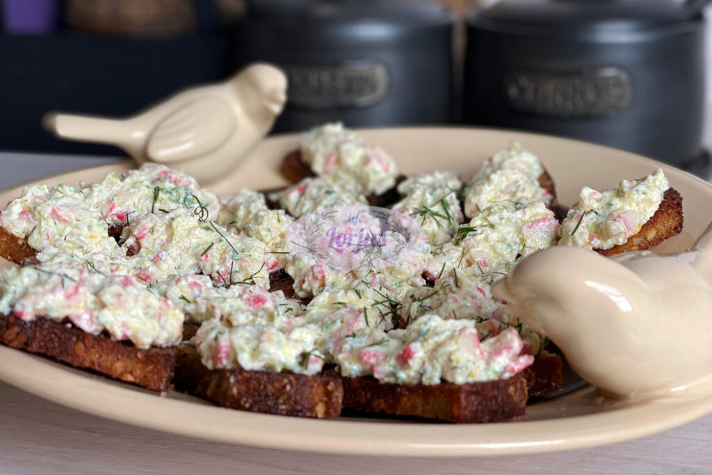 Labai gardi krabų lazdelių ir varškės užtepėlė. Užtepta ant česnaku ištrintos keptos duonos – tikras skanumėlis.