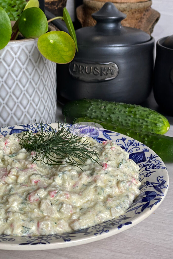- Į dubenį dedame su majonezu sutrintą varškę, beriame smulkintas krabų skonio lazdeles, krapus, petražoles, tarkuotus agurkėlius.