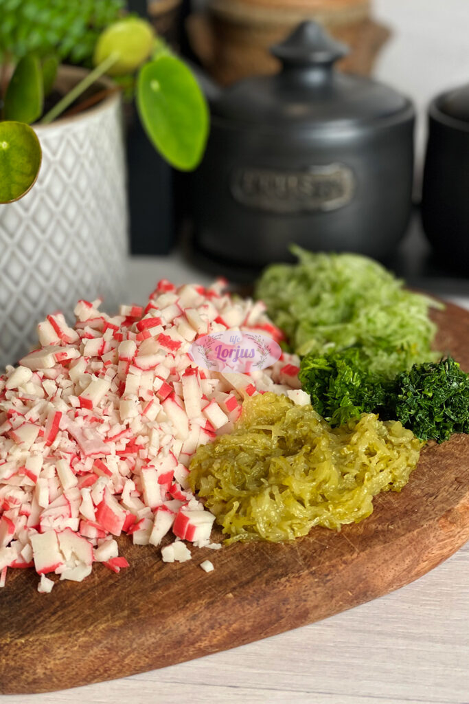 - Krabų skonio lazdeles smulkiai supjaustome.