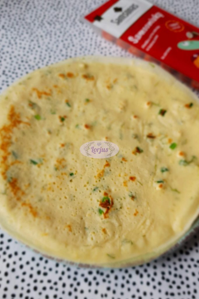 Į gerai įkaitintą keptuvę įpilame tešlos, tolygiai paskirstydami po visą keptuvę. Kepame iš abiejų pusių po keletą minučių.