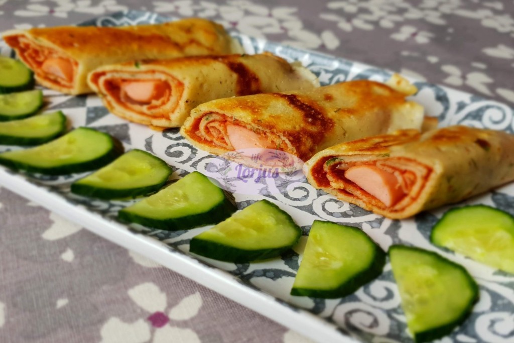 Imame iškepusį lietinį, jei mėgstate vieną jo pusę galite ištepti pomidorų padažu. Pabarstome tarkuotu fermentiniu sūriu, uždedame perpjautas pieniškas dešreles ir susukame.