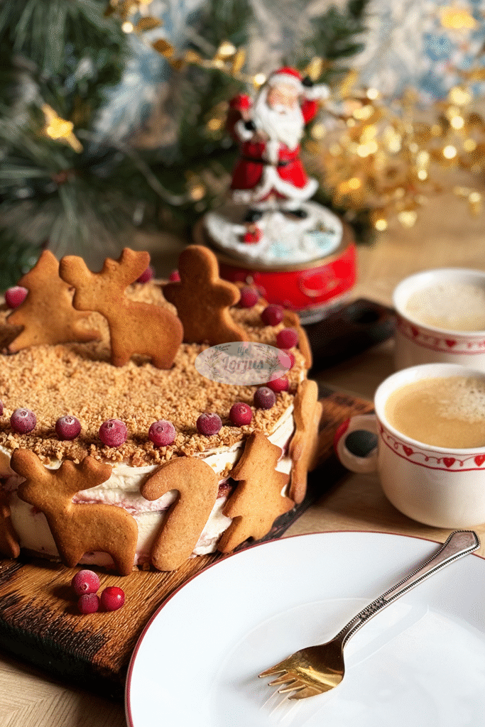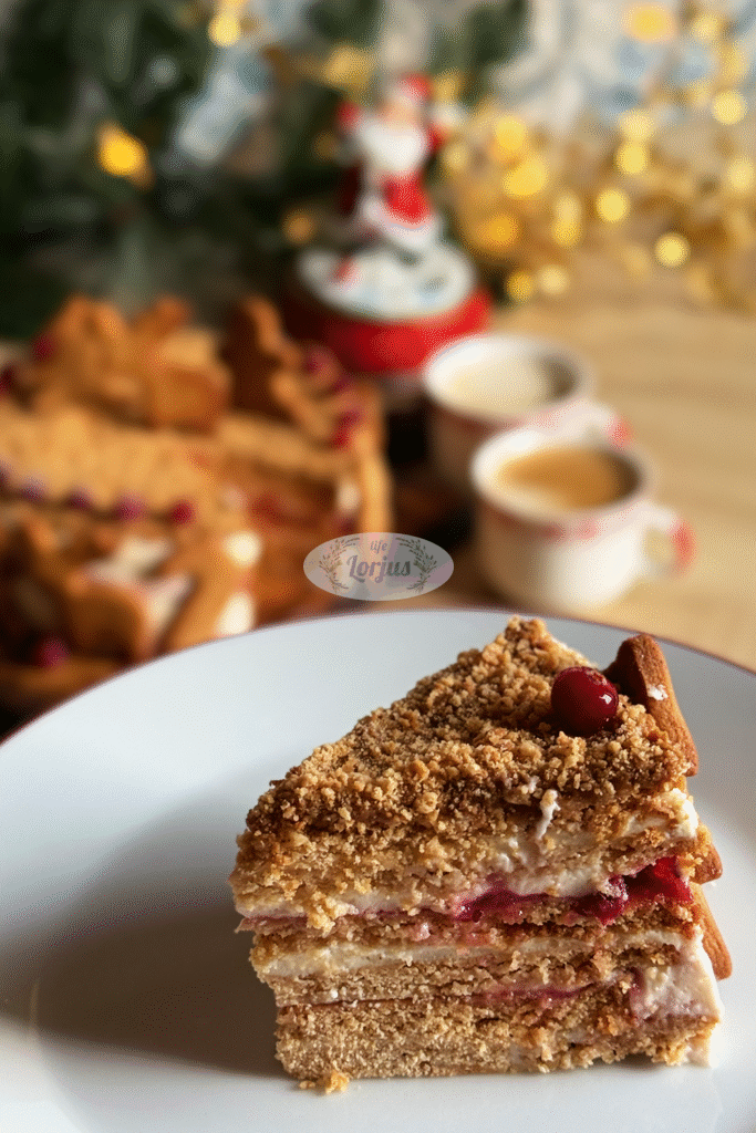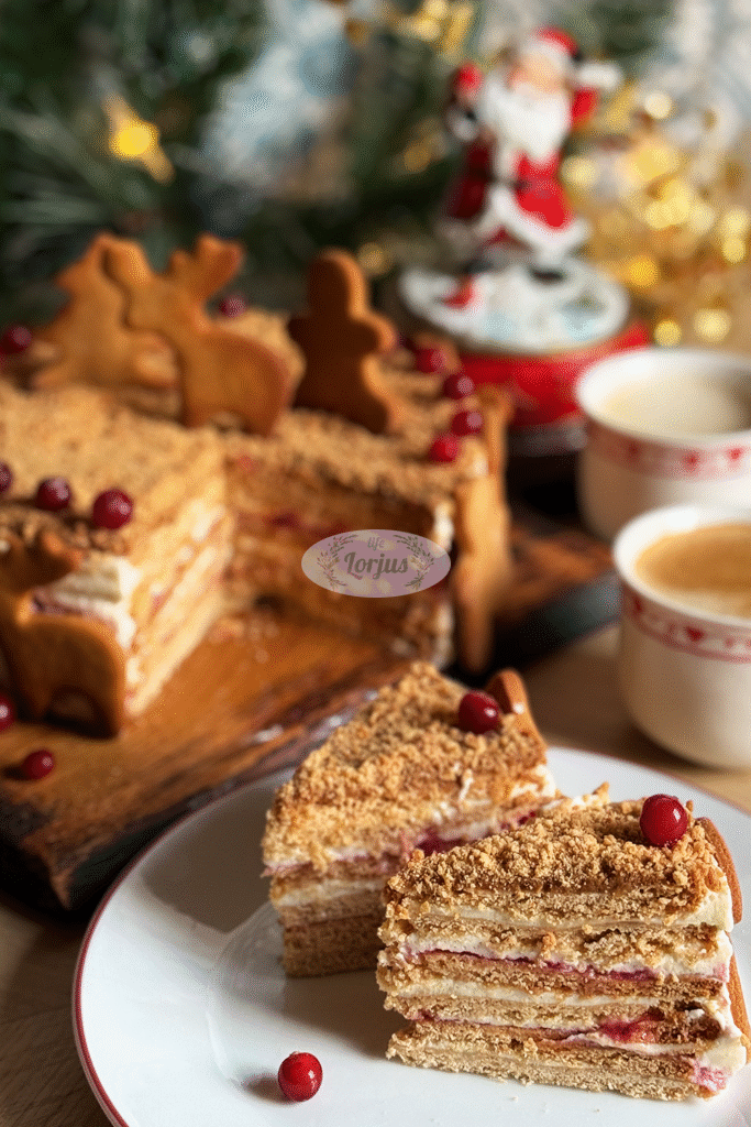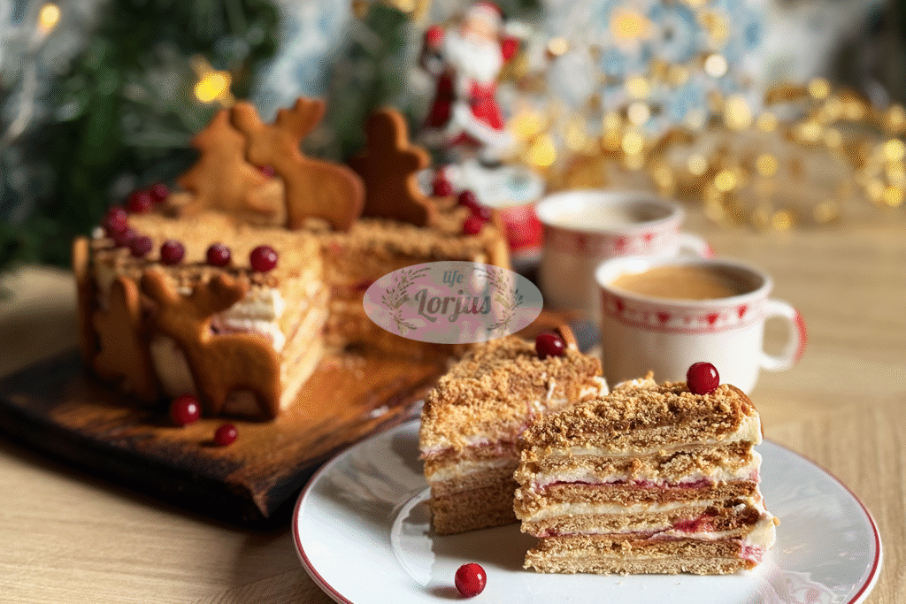Gardžiausias Medutis Kalėdoms – tradicinis sluoksniuotas medaus tortas pagardintas spanguolių uogiene.