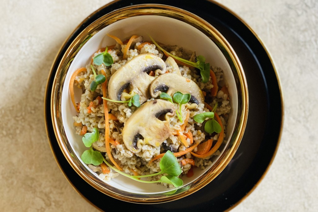 - Miežinių kruopų košė su morkomis ir pievagrybiais paruošta, dedame į lėkštes ir ant viršaus uždedame ridikėlio daigelių.