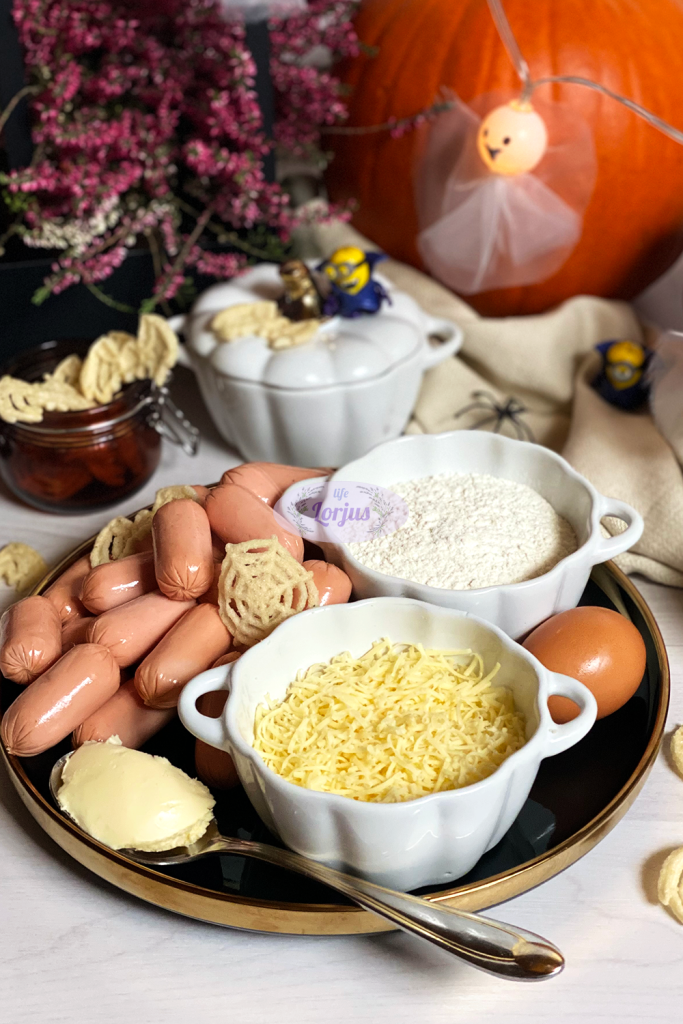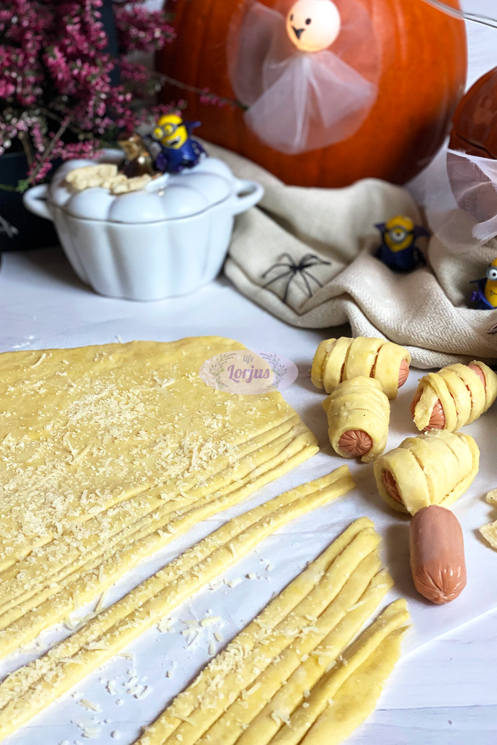 - Iš sūrio išspaudžiame nedidelius apskritimus, kuriuos uždedame ant karštų dešrelių-mumijų, kaip akytes, į vidurį dedame alyvuogės gabalėlį. Galima idėti minutei į karštą orkaitę, kad sūris išsilydytų ir akytės geriau priliptų.